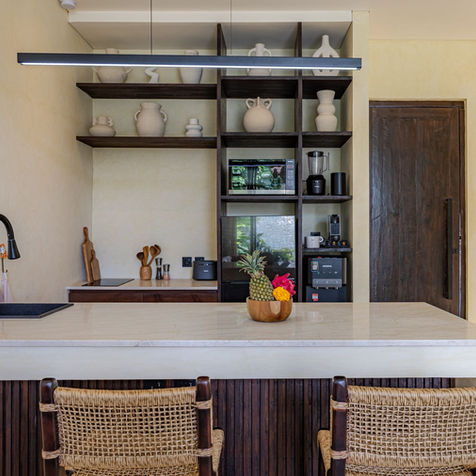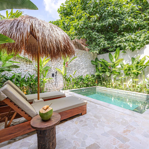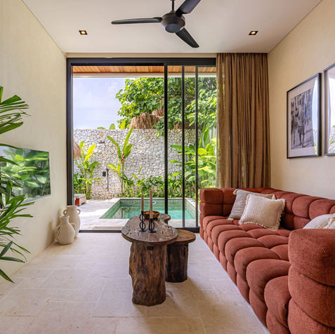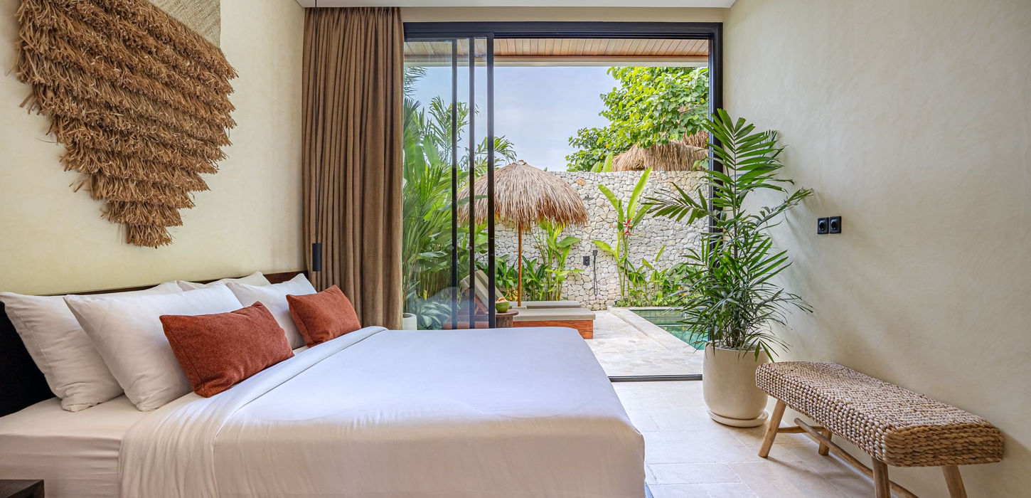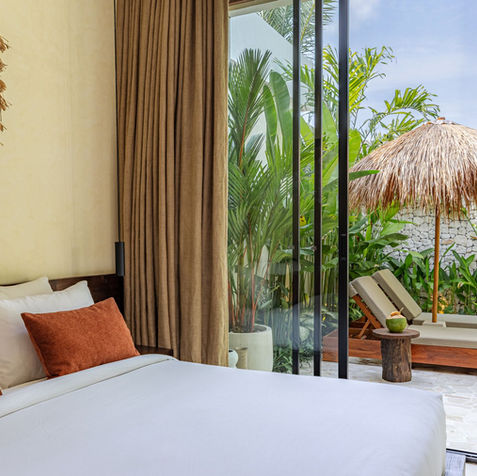 Open de grote glazen schuifdeuren en geniet onmiddellijk van de tropische tuin met comfortabele ligbedden en je eigen zwembad. Perfect voor vroege ochtenden, zonnige middagen of ontspannende avonden.
