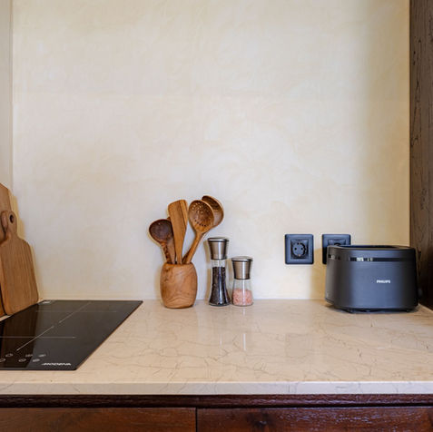 Compleet uitgeruste keuken met o.a. inductie kookplaat, oven / magnetron, blender, Nespresso koffie apparaat, unit met koud, neutraal en kokend drinkwater, koel/vries combinatie en broodrooster