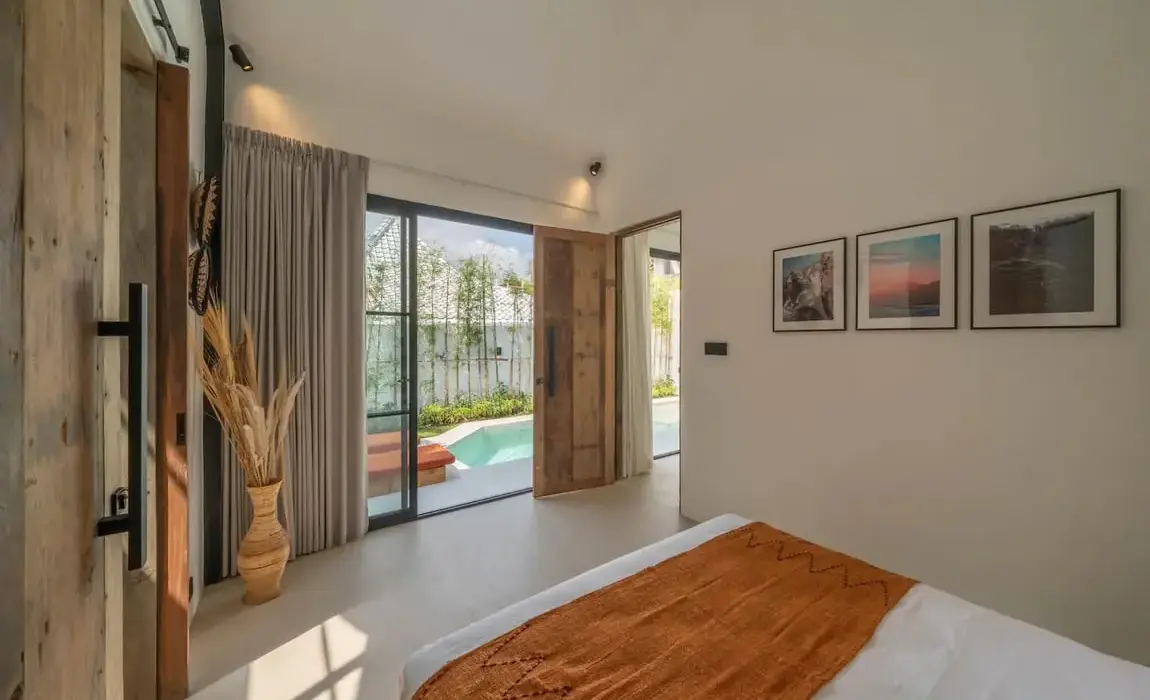 Open de grote glazen schuifdeuren en geniet onmiddellijk van de tropische tuin met comfortabele ligbedden en je eigen zwembad. Perfect voor vroege ochtenden, zonnige middagen of ontspannende avonden.